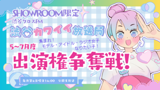 SHOWROOM限定企画! 渋谷クロスFM「渋谷カワイイ放送局」 5~7月度出演権争奪戦 | shibuyakawaii_audition | NO | NO | 0 | 0 | 9,S,A,B,C | 3 | 2026/04/13 18:00:00 | 2026/05/03 21:59:59 | 41732 | 105 | NO | NO | NO | YES | 2026/04/01 17:22:40 | 開催中 | Level (quest) | 23 | |||