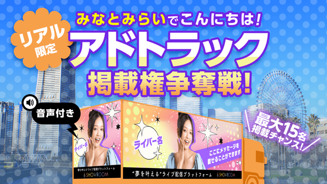 【リアル限定】みなとみらいでこんにちは!アドトラック掲載権争奪戦! | real_adtruck_1 | Target:AllLivers | レベル | 69 |